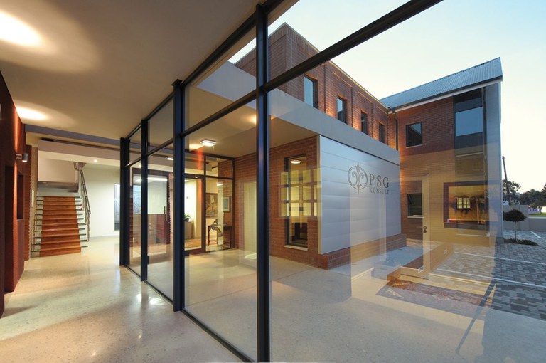 The existing parking area to the west of the building was earmarked for the addition, and the new wing was set back from the street edge to allow the existing historical building to remain prominent. Materials – face brick, glass, steel, aluminium and a polished concrete floor – were specified to deliberately, but sensitively, contrast with those of the existing building. To accommodate and enhance the visual impact and corporate identity, contemporary decorative elements were designed to define the new entrance and create the backdrop for signage.
